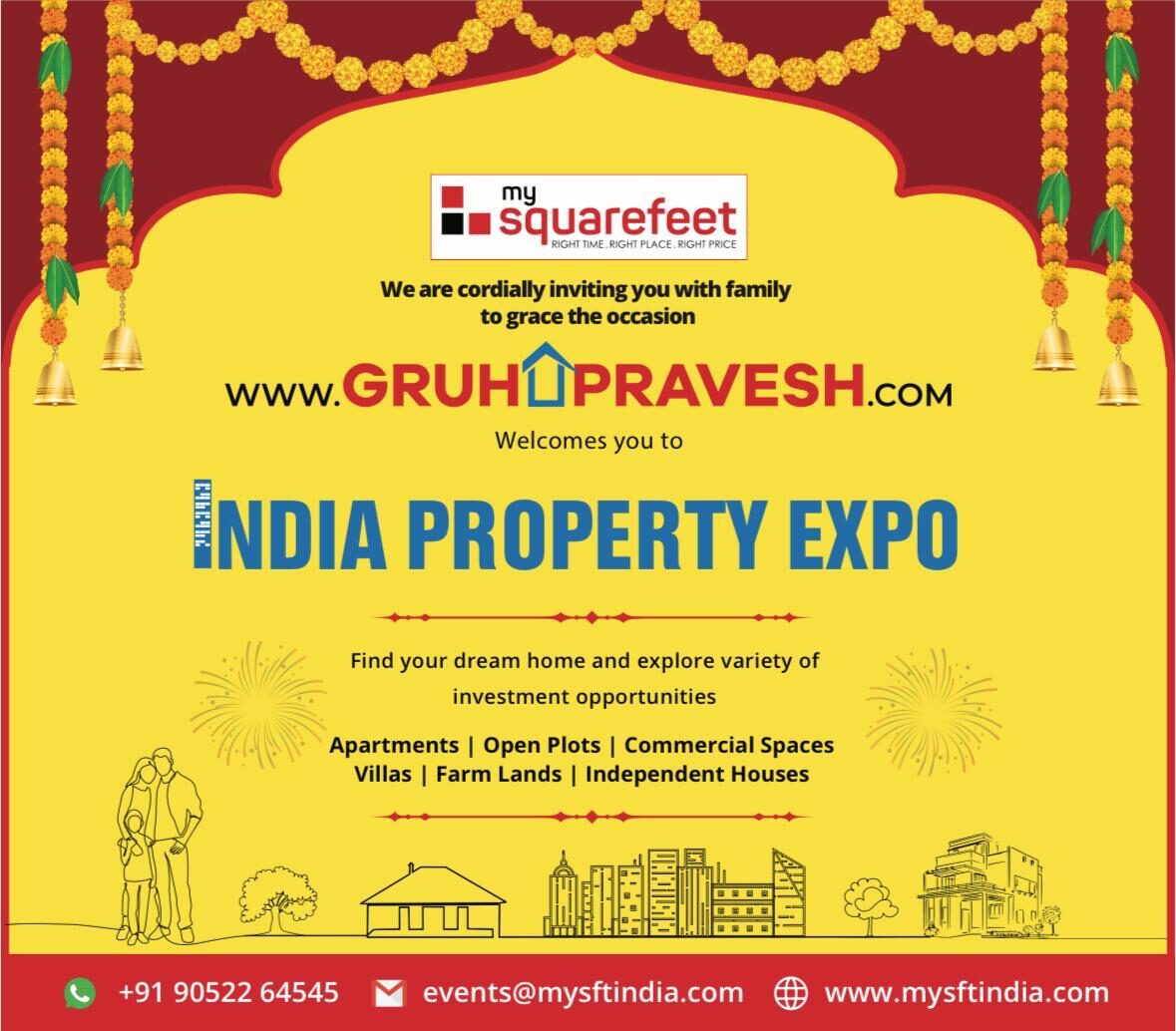 About MySquareFeet India Pvt. Ltd. MySquareFeet is a premier event management company that exclusively caters to the Indian real estate sector. We specialize in organizing international property expos for Indian developers under our flagship brand Gruhapravesh India Property Expo— with a sharp focus on reaching NRI homebuyers across the globe. With years of experience, we bridge the gap between trusted Indian builders and serious overseas investors.